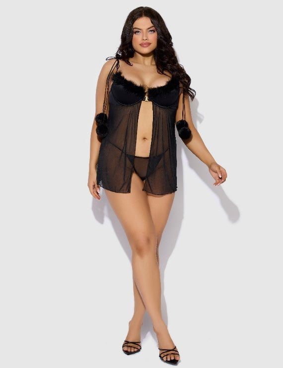 Softness with a wink. This feather-trimmed babydoll set is designed to float around your curves, teasing with every movement.